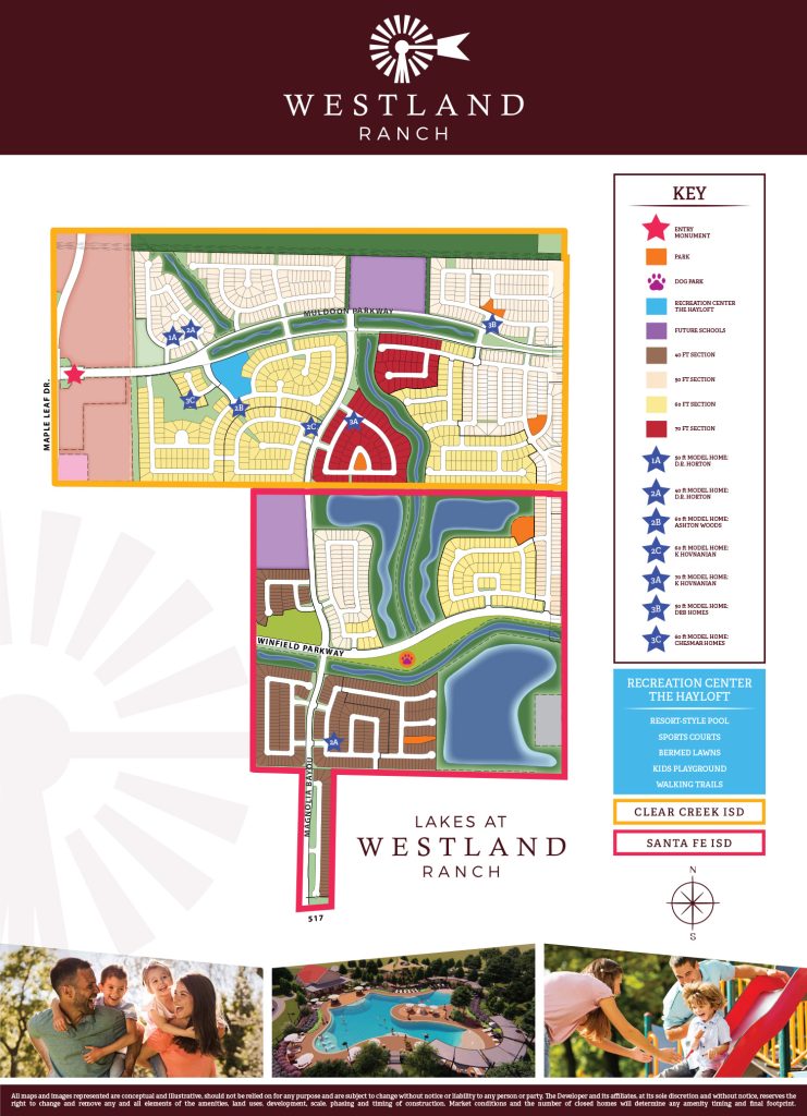 League City Offers Southern Charm And Texas Pride. Forestar’s new master-planned community, Westland Ranch, is being developed in League City. This 838-acre community will be home to 1599 families at completion. Westland Ranch is zoned to Clear Creek ISD and Lakes at Westland Ranch is zoned to Santa Fe ISD. Both neighborhoods offer affordable homes and outstanding amenities.